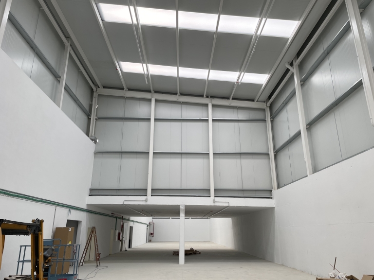 La intervención amplía el edificio en el frente Norte para albergar un nuevo almacén, en espacio independiente, conectado con los dos muelles de carga situados en los laterales. Esto permite ampliar significativamente el espacio de producción de forma eficaz y flexible en las mismas dos naves. Al mismo tiempo se cierra el gran espacio central, para reorganizar y ampliar los usos auxiliares y de formación a través de este gran espacio luminoso, ahora atemperado.